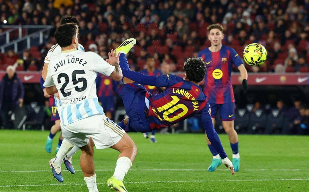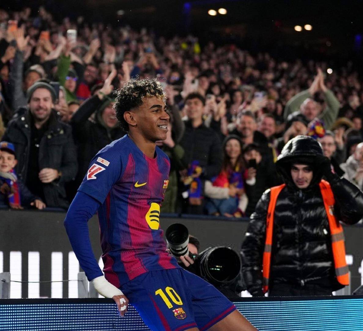 两球领先,胜局已定,巴萨踢得更加放松自如。 第73分钟,全场最精彩的时刻到来。 奥尔莫在右路送出一记精准的斜传,皮球越过防守球员头顶,飞向禁区后点。 此时,年仅小将亚马尔高速插上,他没有选择常规的停球射门,而是在皮球即将落地的一刹那,整个身体腾空而起,用一记舒展的侧身凌空倒钩,将球狠狠地抽进了球门的上角。 整个诺坎普瞬间被点燃,这记充满想象力和技术难度的进球,彻底杀死了比赛悬念。 最终,比分定格在3-0。