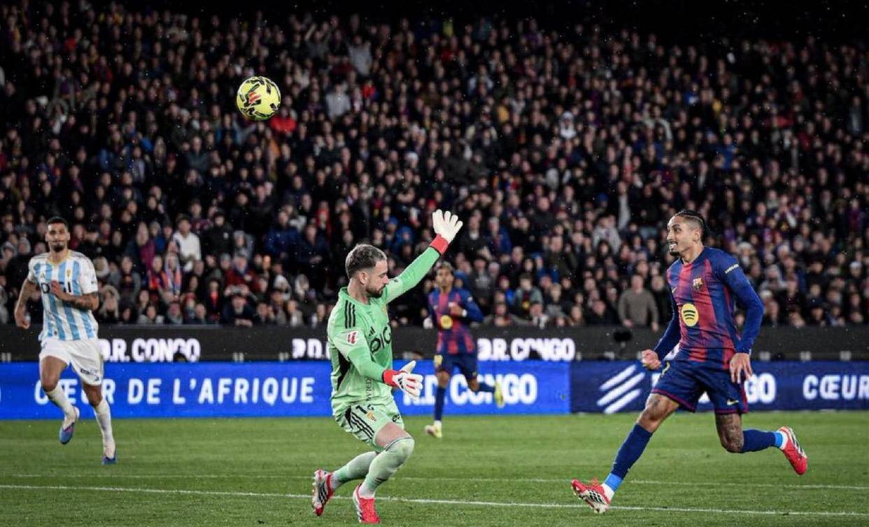 这个进球仿佛抽走了奥维耶多球员最后一口心气。 仅仅5分钟后,灾难再次降临。 奥维耶多后卫在一次并无太大威胁的回传门将时出现致命失误,传球力量过轻。 心领神会的拉菲尼亚如闪电般插上,抢在出击的门将之前拿到皮球,随后轻巧地一记挑射,让皮球越过门将头顶,坠入空门。 2-0! 从被严防死守到两球领先,巴萨只用了不到十分钟。 这两个进球都并非通过精妙的团队配合打进,而是直接来源于对手在后场低级的传球失误,但这恰恰是高位逼抢战术最希望看到的结果。